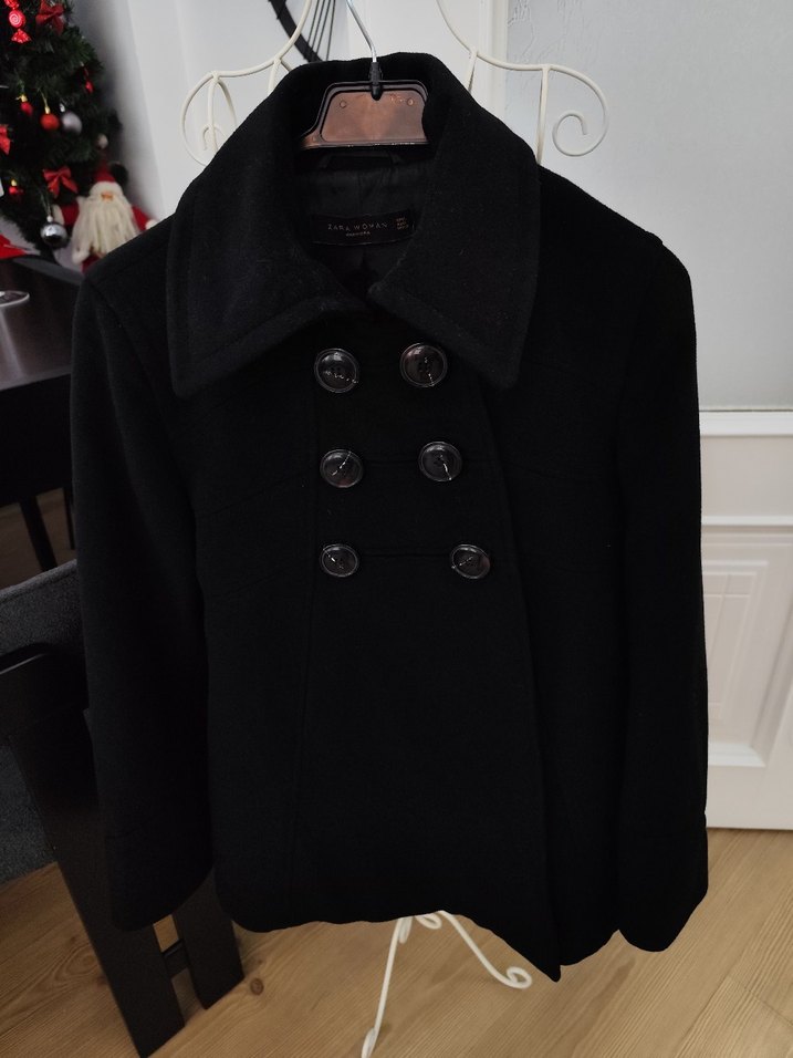 Geniş yakalı, çift düğmeli siyah ceket Sıcak ve yumuşak kumaştan üretilmiştir, soğuk havalar için uygundur. ürünün koltuk altı kısmında sökük var dikebilirsiniz başka hiçbir sorunu yok sıfır kadar temiz