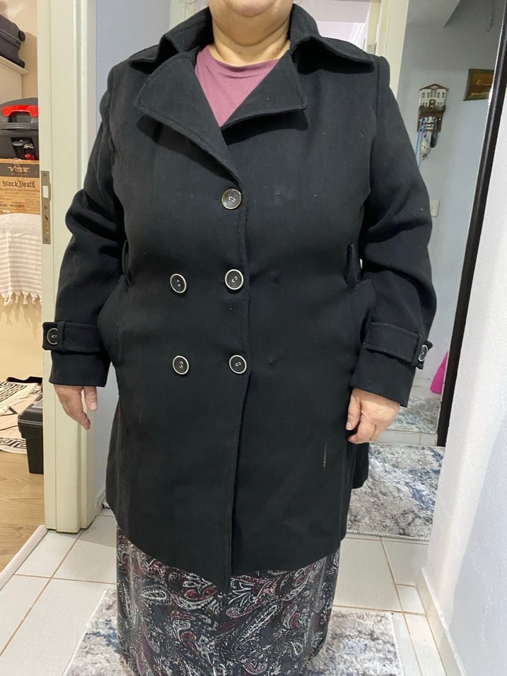 Siyah çift düğmeli kaban, düğme detayları ve manşet kayışları ile sıcak tutan kumaştan üretilmiştir.