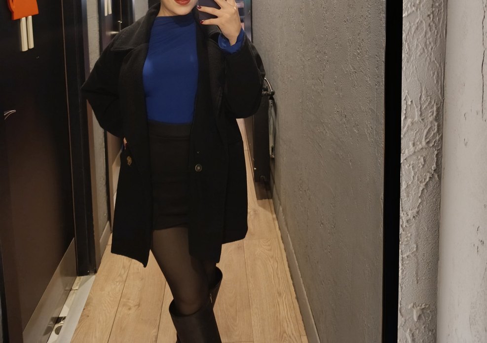 Geniş yakalı, çift düğmeli ve ön cepli siyah kaban, iç kısmı yumuşak astarlıdır.