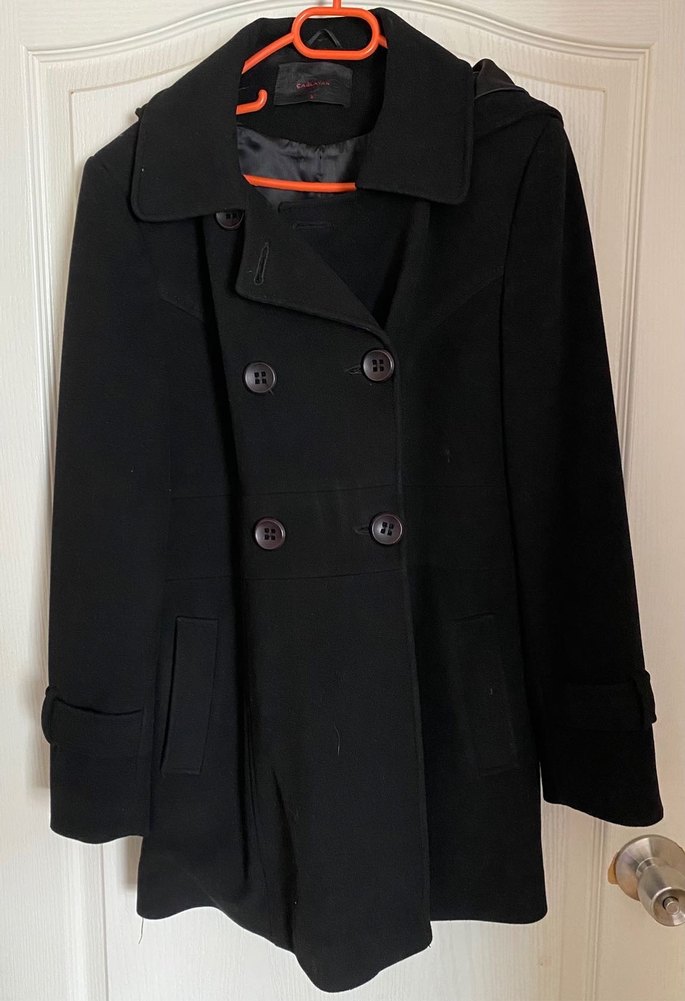 Siyah çift düğmeli kaban, düğme detayları ve yan ceplerle, klasik yakalı kapüşonlu ve uzun kollu.