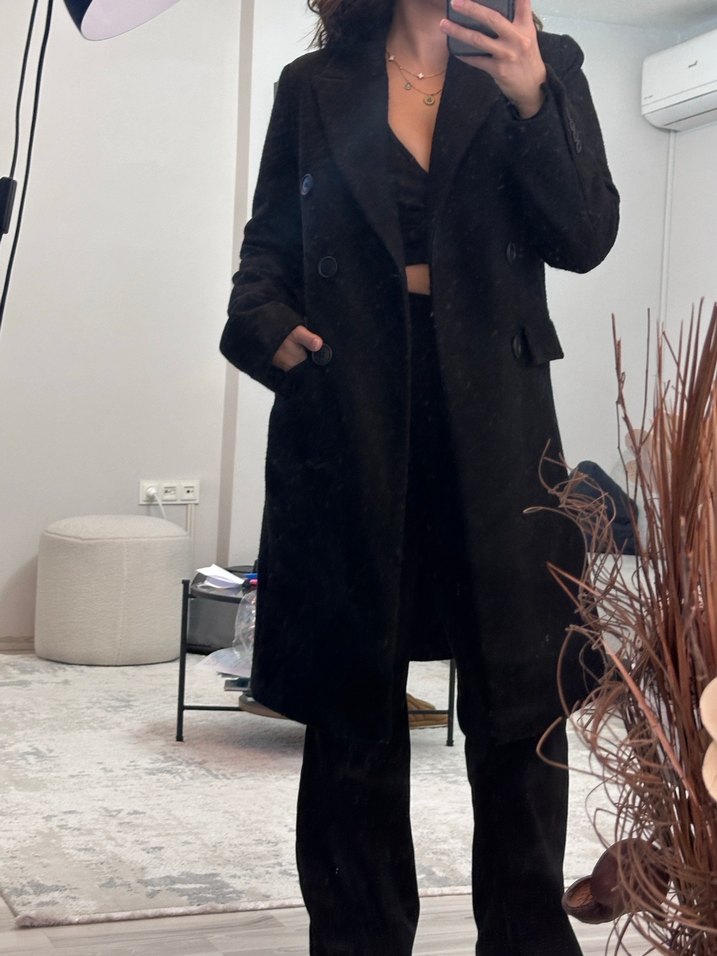 Siyah çift düğmeli kaban, klasik yaka ve yan ceplerle şık ve zarif bir görünüm sunar.