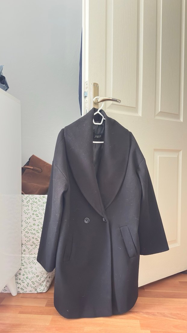 Siyah renkli, çift düğmeli ve iki yan cepli kalın, sıcak tutan kumaştan kaban.