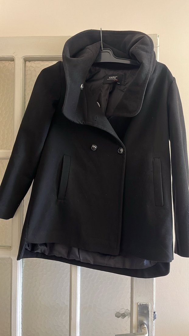 Yumuşak ve sıcak kumaştan yapılmış, yüksek yakalı siyah çift düğmeli kaban. Yan ceplidir.