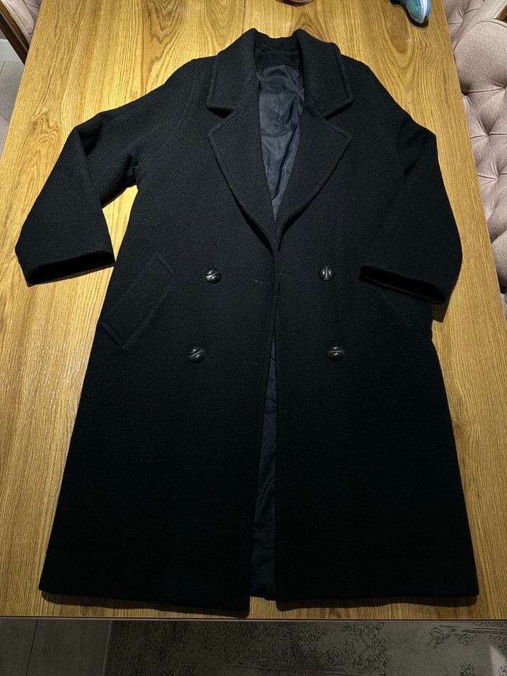 Siyah çift düğmeli, klasik yakalı ve yan cepli kaban. Yumuşak ve sıcak bir kumaştan üretilmiştir. Soğuk hava için uygundur. Üründe herhangi bir sorun yoktur. Artık giymediğim için satıyorum S-M beden işin uygundur