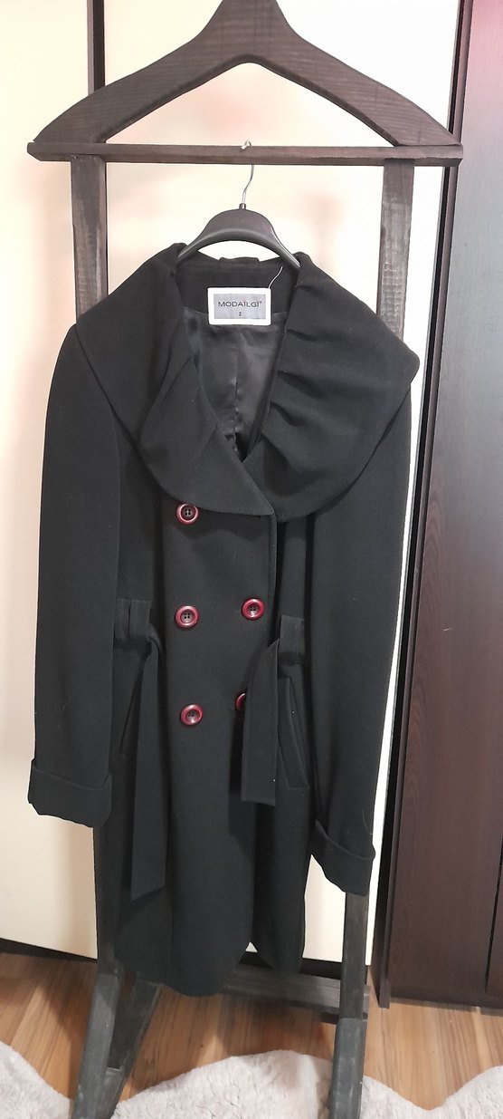 Geniş yakalı, yan cepli siyah çift düğmeli kaşe kaban