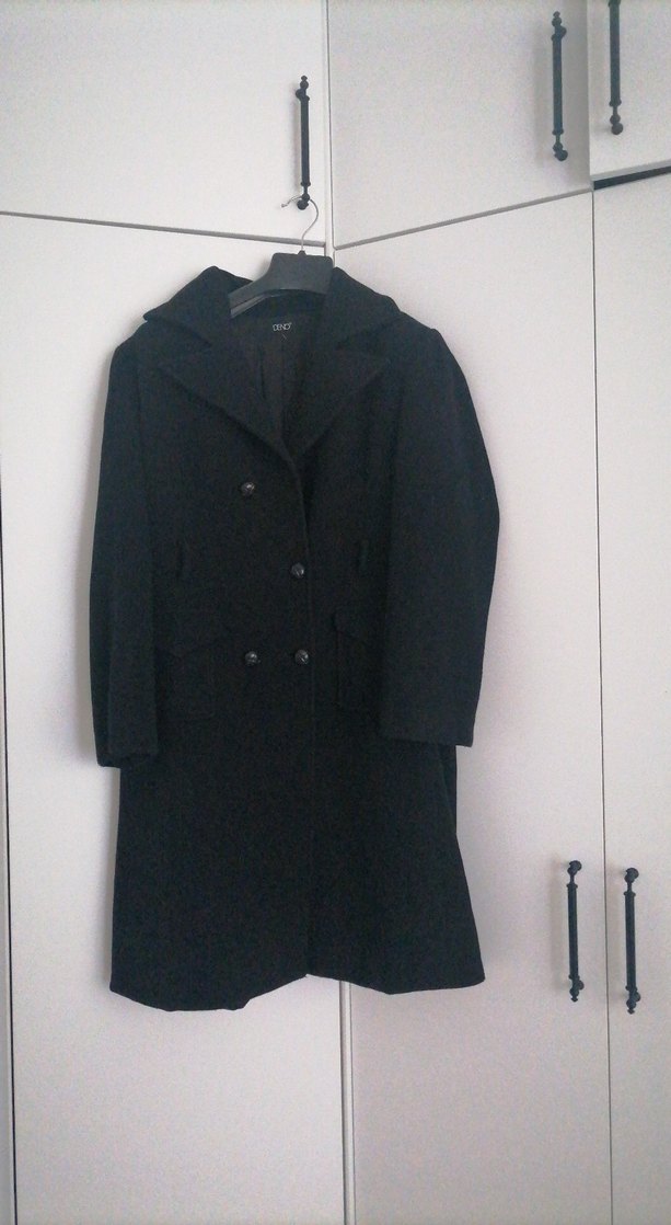 Kapüşonlu ve uzun kollu siyah çift düğmeli kaban, klasik ve sıcak bir dış giyim seçeneği sunar.
