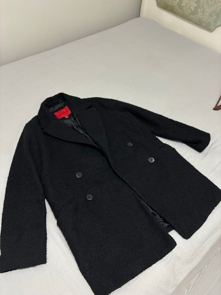 Siyah çift düğmeli kaban, klasik yakalı ve uzun kolludur. İki ön cepli ve yumuşak astarlıdır. S beden ama m bedene daha iyi olacaktır