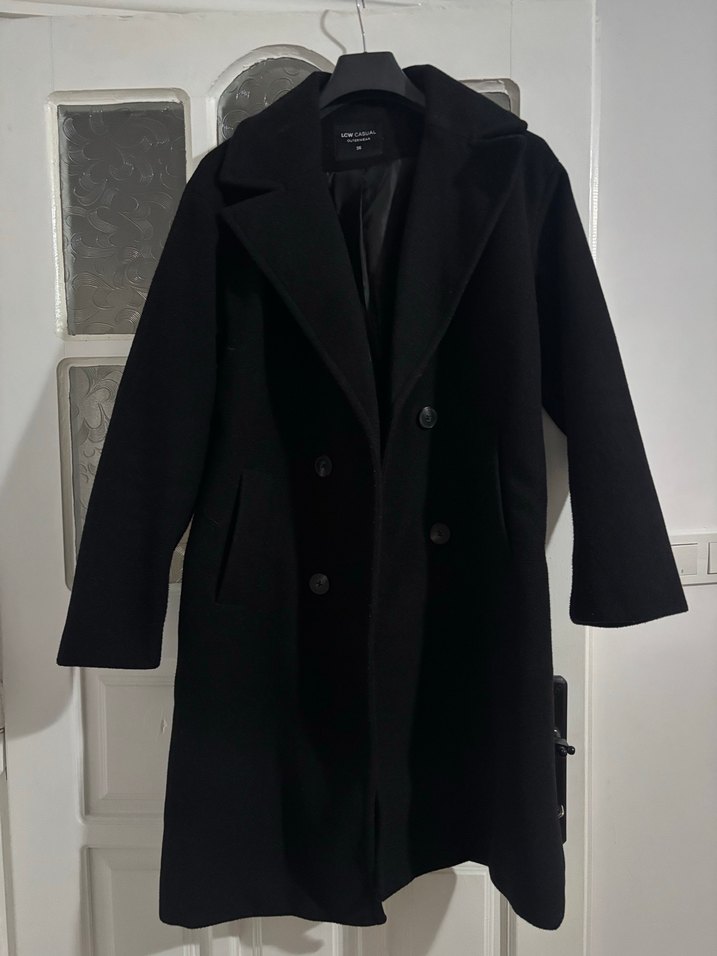 Siyah renkli, çift düğmeli, uzun kollu ve yan cepli klasik kaban.