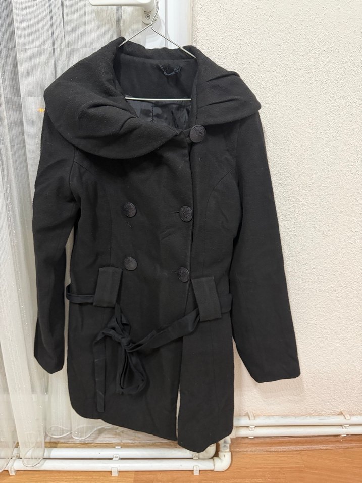 Geniş yakalı, çift düğmeli ve bel kemerli siyah kadın kaban. Yumuşak ve sıcak kumaştan üretilmiştir.