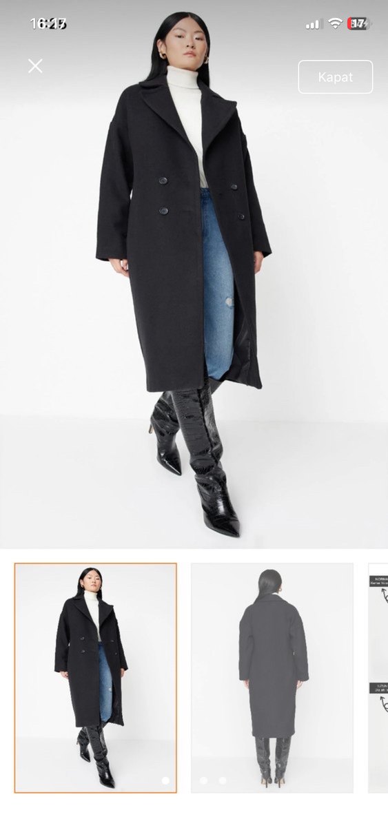 Kadınlar için çift düğmeli, uzun ve düz kesim siyah kaban. Klasik yakalı ve sıcak, yumuşak kumaştan üretilmiştir. Şık ve zamansız tasarım.
