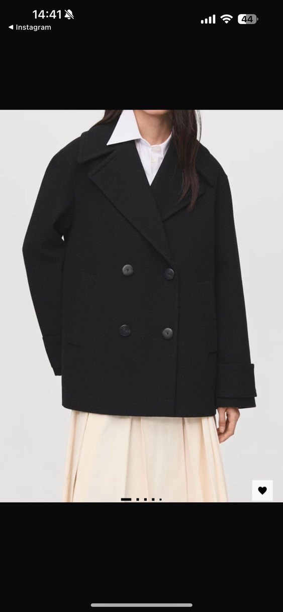 Siyah kısa kaban, çift düğmeli ve geniş yakalıdır. Uzun kollu ve manşet detaylı, şık ve klasik bir görünüme sahiptir.