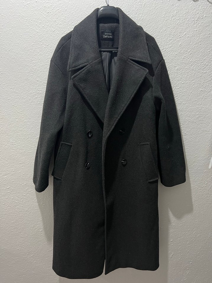 Siyah renkli, çift düğmeli uzun kaban, geniş yakalı ve yan cepli klasik tasarıma sahiptir.