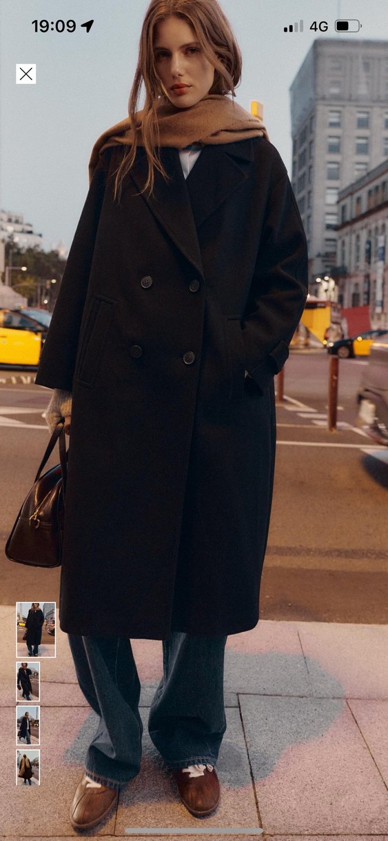 Klasik yakalı, çift düğmeli siyah uzun kaban, yan ceplidir ve şık bir dış giyim seçeneği sunar. Kolları çok uzun olduğu için biraz kestirdim