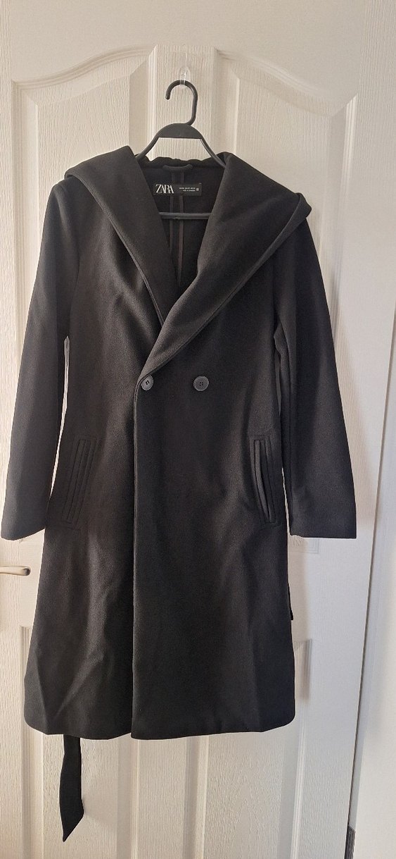 Siyah çift düğmeli uzun kaban, geniş yakalı ve yumuşak, sıcak tutan kumaştan yapılmıştır. İki yan ceplidir.