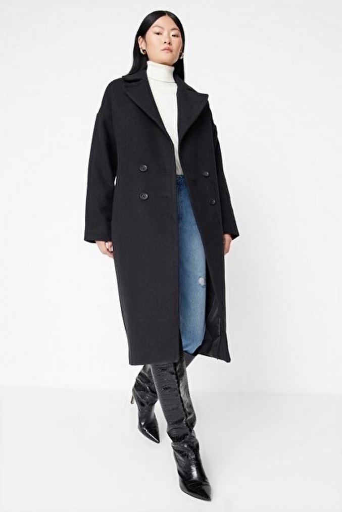 Siyah renkte, çift düğmeli, geniş yakalı uzun kaban. Hem şık hem rahat kombinlere uygun klasik tasarım.