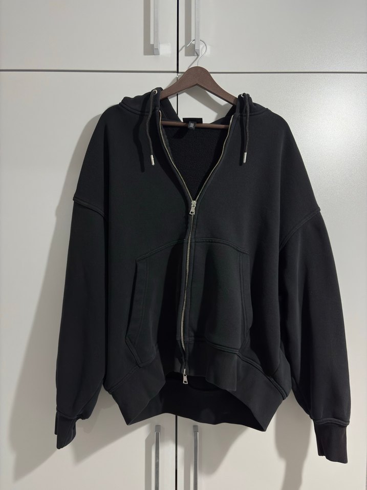 Siyah, fermuarlı ve yüksek yakalı bu sweatshirt, bol kesim ve uzun kolludur. Yumuşak, sıcak kumaştan yapılmış olup günlük rahat sokak stili sunar.