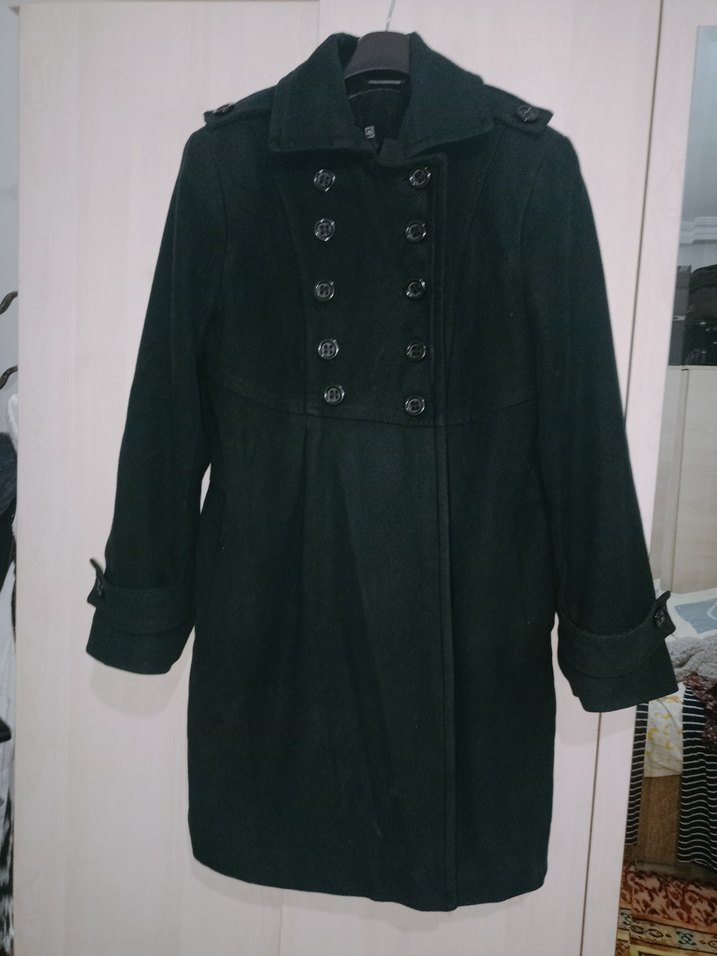 Siyah renkli, çift sıralı düğmeli uzun kollu kaban. Klasik yaka ve manşet ile omuzlarda bant detayları bulunur.