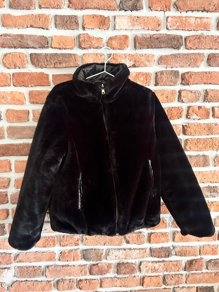 Siyah, kürk detaylı, uzun kollu, yüksek yakalı, kısa kesim, rahat ve sıcak tutan kadın mont.