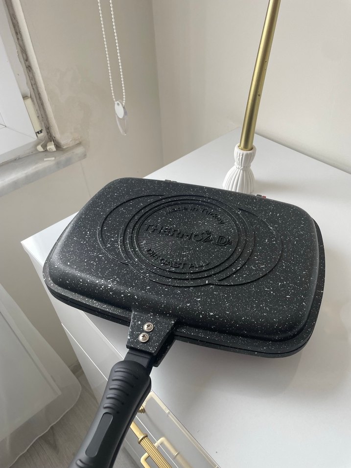 Dokulu yüzeye ve rahat tutuş sağlayan sapı olan siyah çift taraflı tava. Izgara ve kızartma için uygundur.