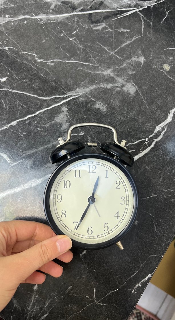 Siyah çift zilli masa saati, 6, 10, 5, 12 ve 8 rakamları okunabilir. Üstte metal kulplu klasik tasarıma sahip. ⏰