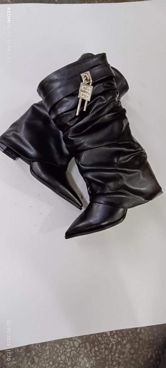Siyah deri, tokalı ve dolgu topuklu diz boyu çizme, desen içermeyen şık tasarım. Gotik tarz için uygun.