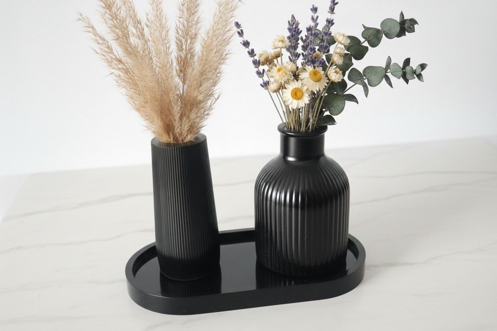 Siyah Çizgili 3'lü Vazo ve Tepsi Epoksi Set