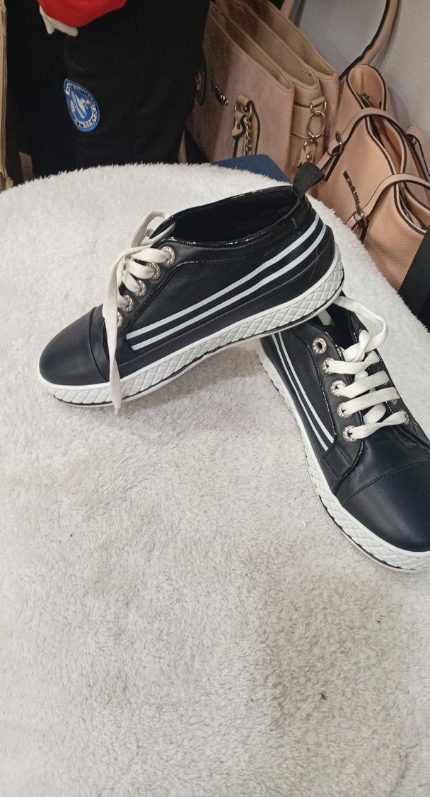 Siyah çizgili, bağcıklı ve stiletto topuklu kadın spor ayakkabısı, günlük kullanıma uygun dayanıklı kauçuk tabanlıdır.