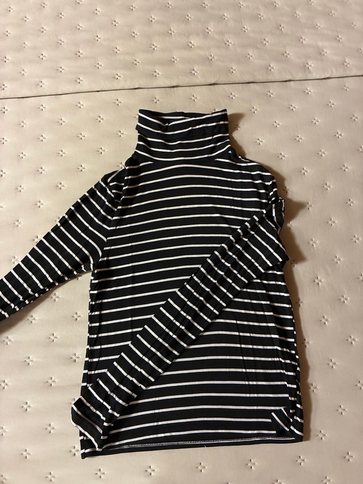siyah beyaz çizgili, balıkçı yaka ve uzun kollu ince triko. Pamuklu, rahat ve şık sokak tarzı kıyafet.