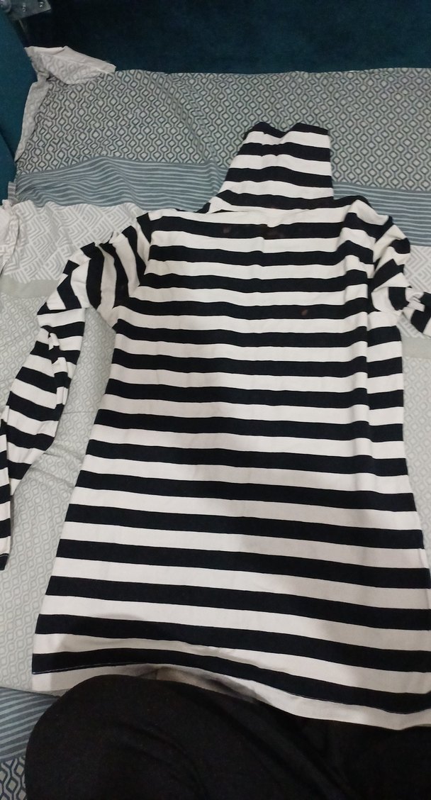 Boğazlı, uzun kollu, çizgili ve düğmeli siyah tişört, rahat sentetik kumaştan günlük kullanıma uygundur.Üründe çamaşır suyu lekeleri vardır.Marka temsilidir.