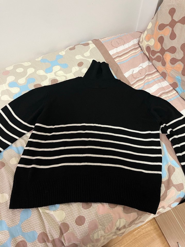 Siyah triko kumaştan üretilmiş, boğazlı ve uzun kollu, beyaz çizgili, rahat kesimli bir kazaktır.