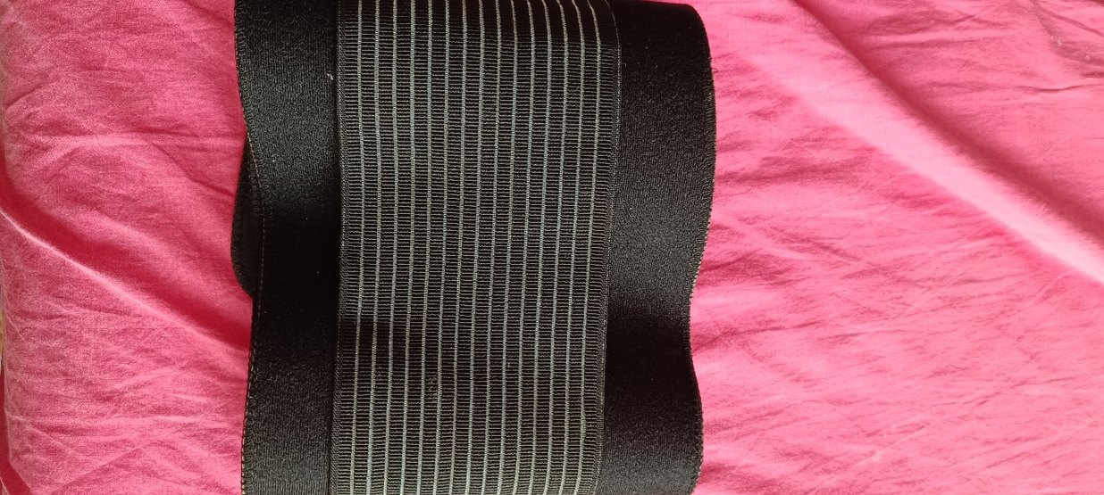 Çizgili desenli, siyah renkli, vücuda oturan midi uzunlukta emzirme korsesi.
