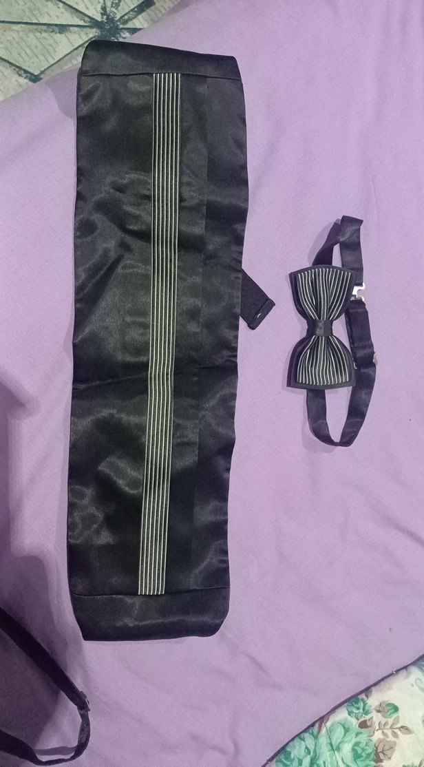 Dikey çizgili siyah papyon ve uyumlu kuşak, koyu ve avangart tarzda. Modaya uygun gotik görünüm için ideal.
