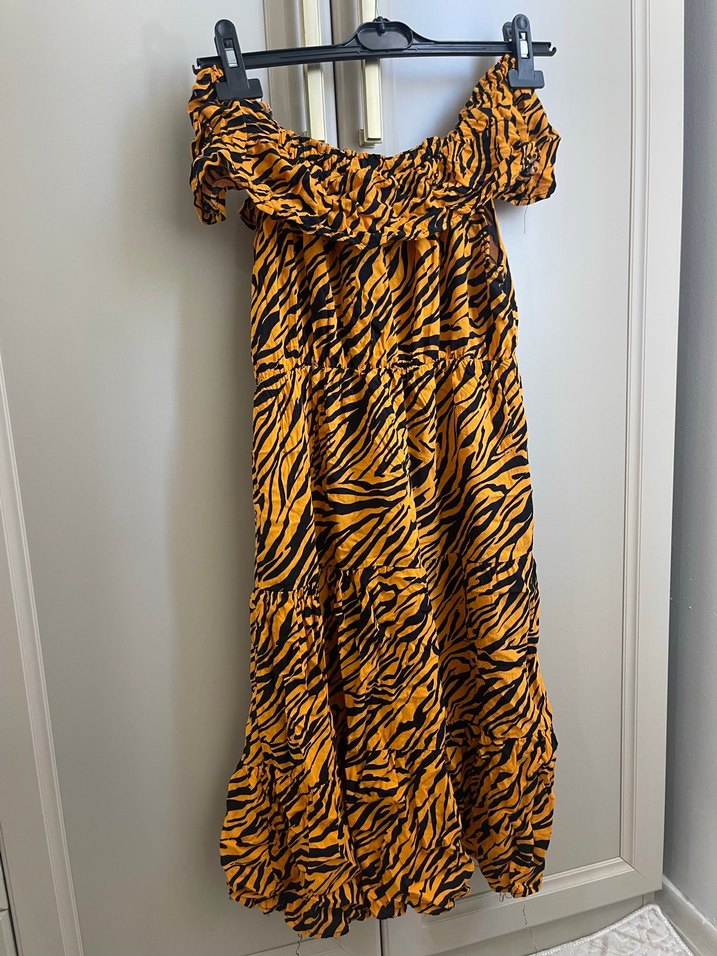 Hardal zebra desenli, midi boy ve bol kesim elbise, kayık yaka ve askılı kollara sahip, sentetik kumaştan üretilmiştir. Bohem tarz için uygundur.