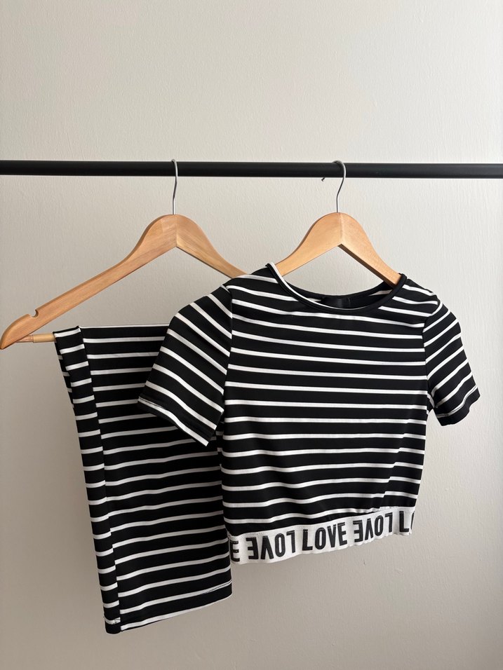 Siyah ve gri çizgili, kısa kollu, tekne yaka ve elastik 'LOVE' yazılı detaylı, pamuklu tişört. Rahat ve şık günlük kullanım için uygun.