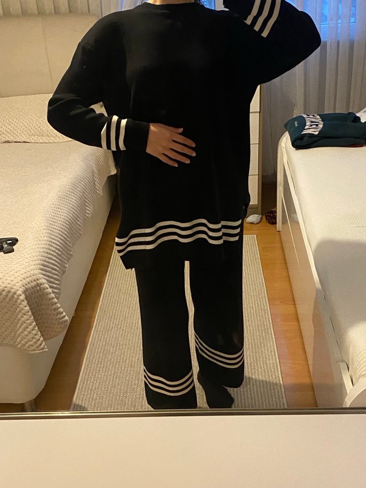 Siyah renkli, yüksek yakalı ve uzun kollu kadın eşofman takımı, çizgili detaylara sahip. Rahat kesimi ve yumuşak, sıcak kumaşıyla günlük kullanım için uygundur.