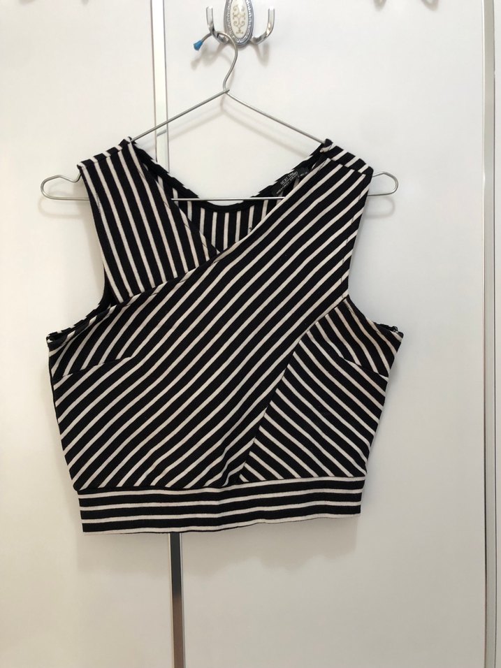 Siyah çizgili, kolsuz, kısa kesim kadın crop top. V yaka ve pileli detaylara sahip, triko kumaştan şık bir sokak giyimi parçası.