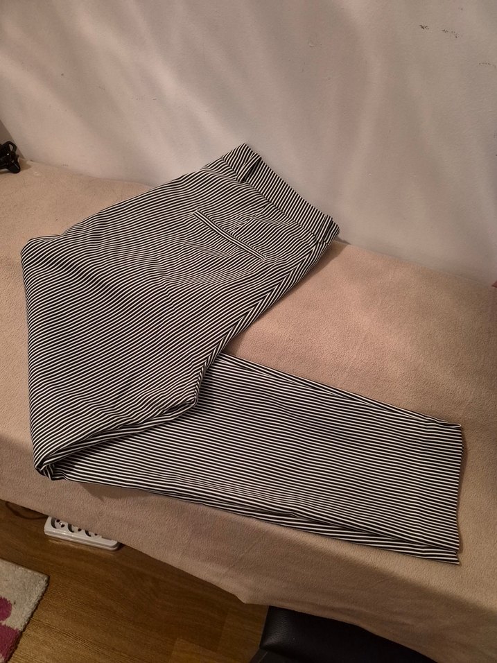 siyah çizgili kadın kumaş pantolon, rahat kesimiyle ofis ve günlük sokak tarzına uygundur.yeni gibi sayılı giyildi.boy 94 cm,paça ucunda yırtmacı var.likrali esnek,arka cep süs cepli