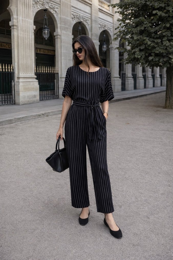 Siyah Çizgili Kadın Midi Tulum