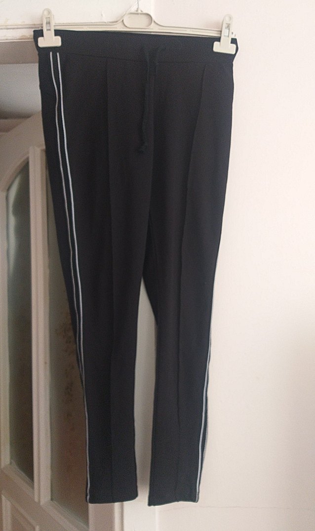 Siyah, çizgili ve elastik bel detaylı kadın spor pantolonu. Normal boy ve regular fit kesime sahip, günlük kullanım için uygundur.