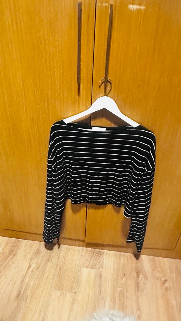 Uzun kollu, kayık yaka siyah bluz, bol kesim ve pileli çizgili desene sahip, günlük kullanım için uygun.