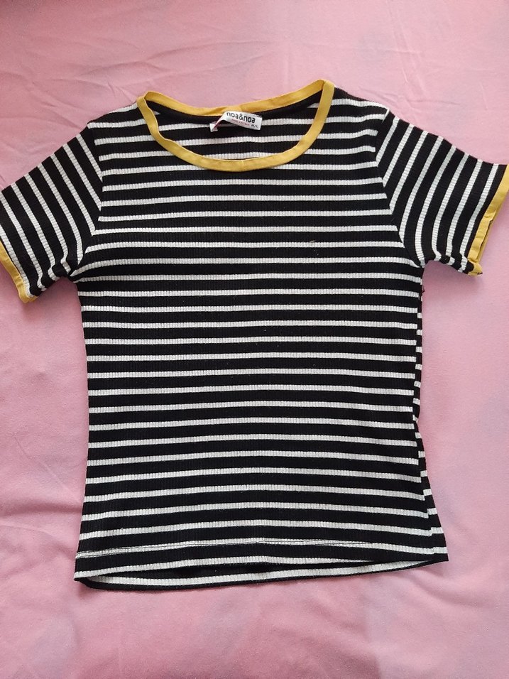 Kısa kollu, tekne yaka, siyah beyaz çizgili ve sarı detaylı, sentetik kumaştan yapılmış, rahat kesimli kadın tişörtü.