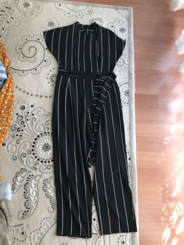 Siyah çizgili, straplez ve askılı kollu, kemerli, regular fit uzun tulum. Günlük kullanıma uygun, trend sokak stili.
