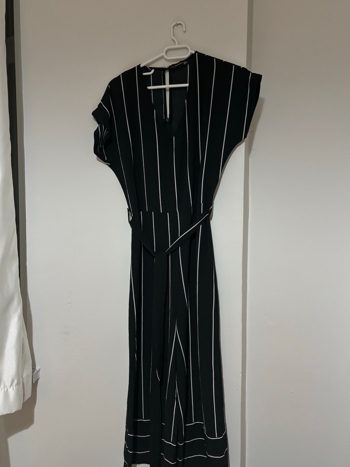 Siyah çizgili uzun tulum, V yakalı ve askılı kollarıyla ön plana çıkar. Belden kemerli, rahat kesim, ofis ve sokak modasına uygundur.