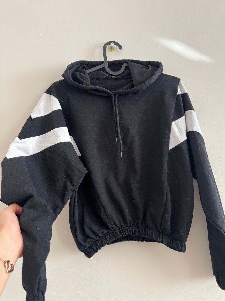 Uzun kollu, beyaz çizgili siyah kadın sweatshirtü. Kapüşonlu, fitted kesim ve normal boyda, fermuarlı detaylı, yumuşak kumaştan.