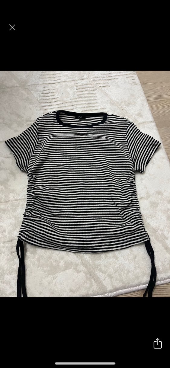 Pamuk kumaştan, kısa kollu ve tekne yaka siyah beyaz çizgili, yanları pileli ve bağcıklı, vücuda oturan bluz