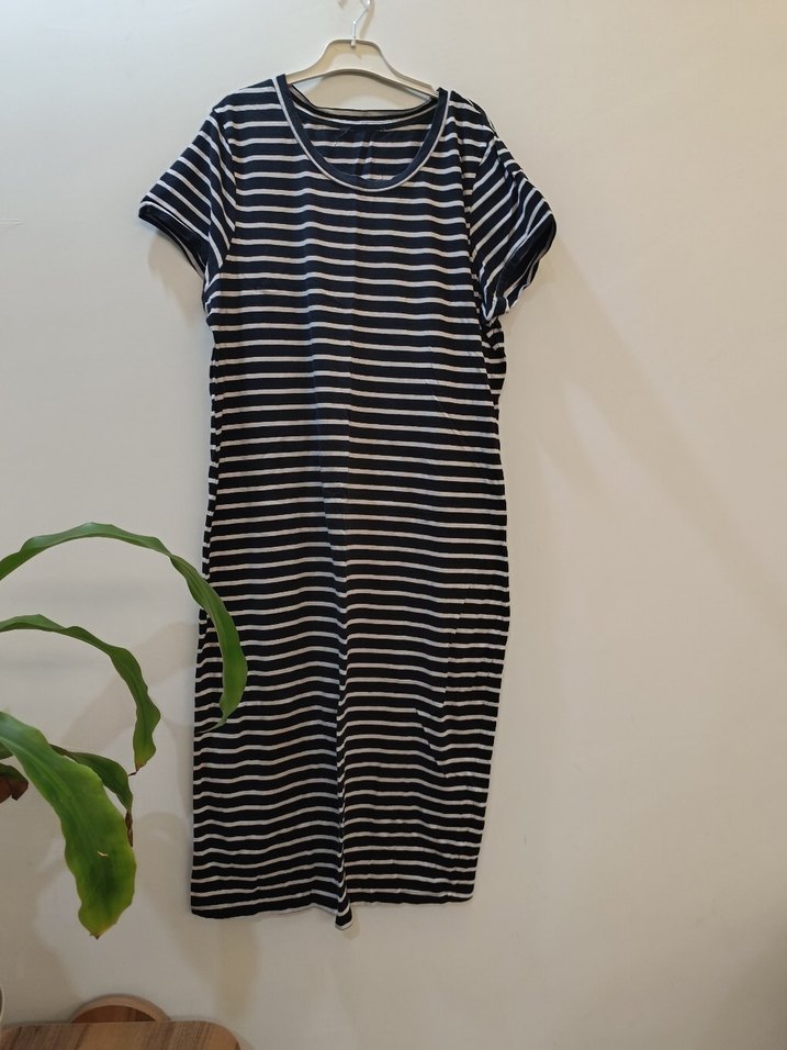 siyah renkli, kısa kollu ve yuvarlak yaka uzun elbise. Çizgili deseni detaylarıyla sade ve şık, penye yazlık kumaştan üretilmiştir. marka temsili tertemiz