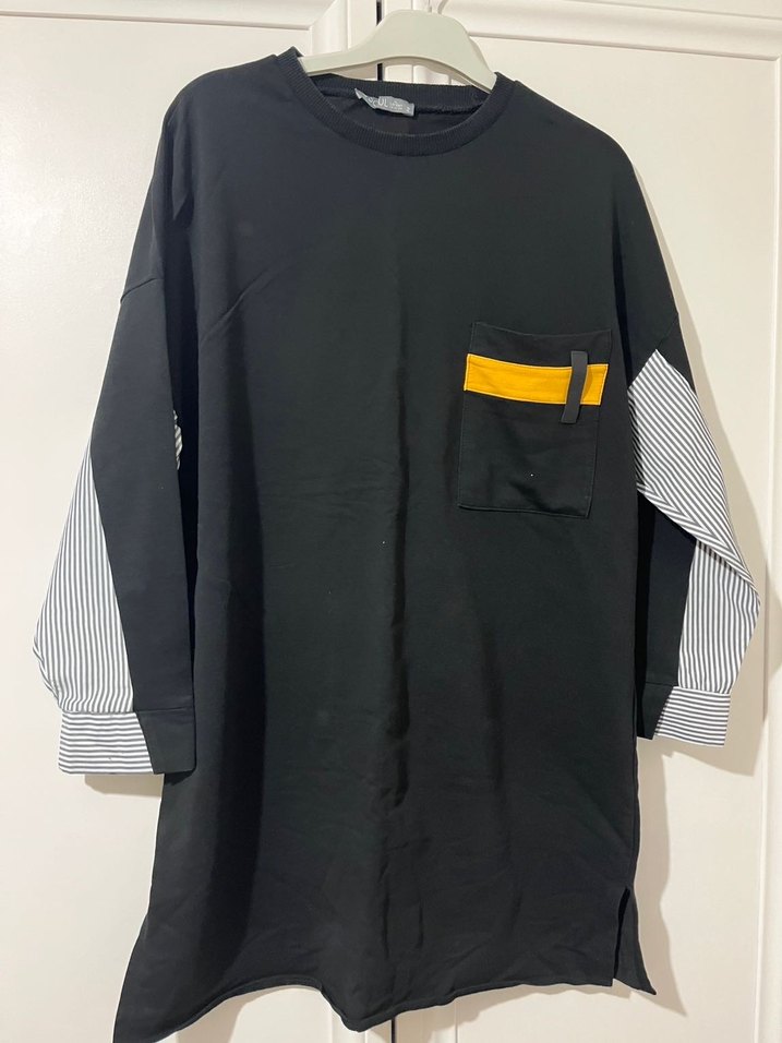 Siyah uzun kollu tunik, bol kesim ve midi boyda. Yuvarlak yaka, çizgili kollar, sarı detaylı cep ve kemer bulunur. Günlük sokak stiline uygun. Çok giyilmedi defosu bellidir