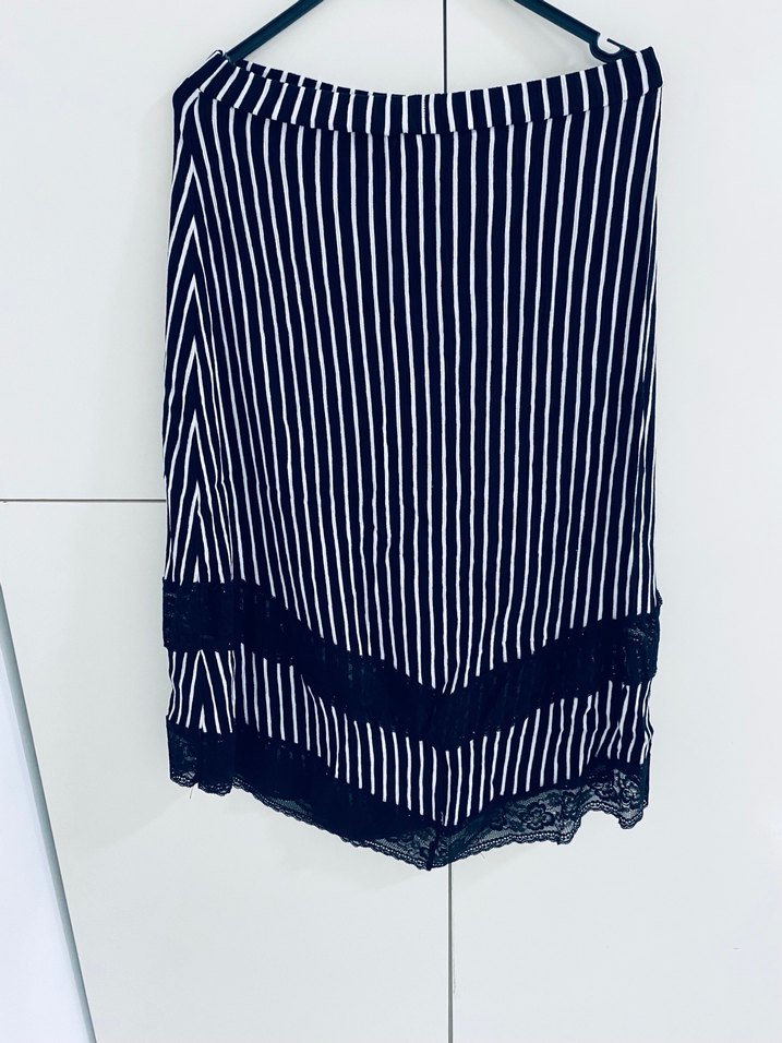 Siyah renkli, çizgili ve midi boy ithal etek. Düz kesimli, dantel detaylı etek, yumuşak esnek tekstil kumaştan yapılmıştır. Günlük sokak tarzı için uygundur.