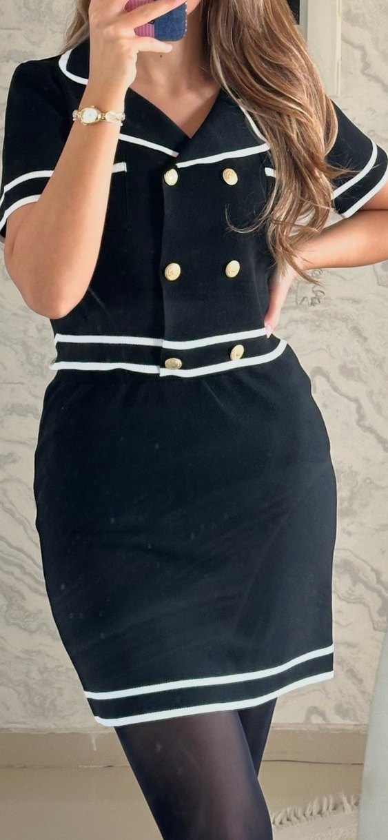 Düğmeli, V yaka ve askılı kollu, siyah beyaz çizgili, vücuda oturan midi elbise. Ofis için uygun, sentetik kumaştan yapılmıştır.