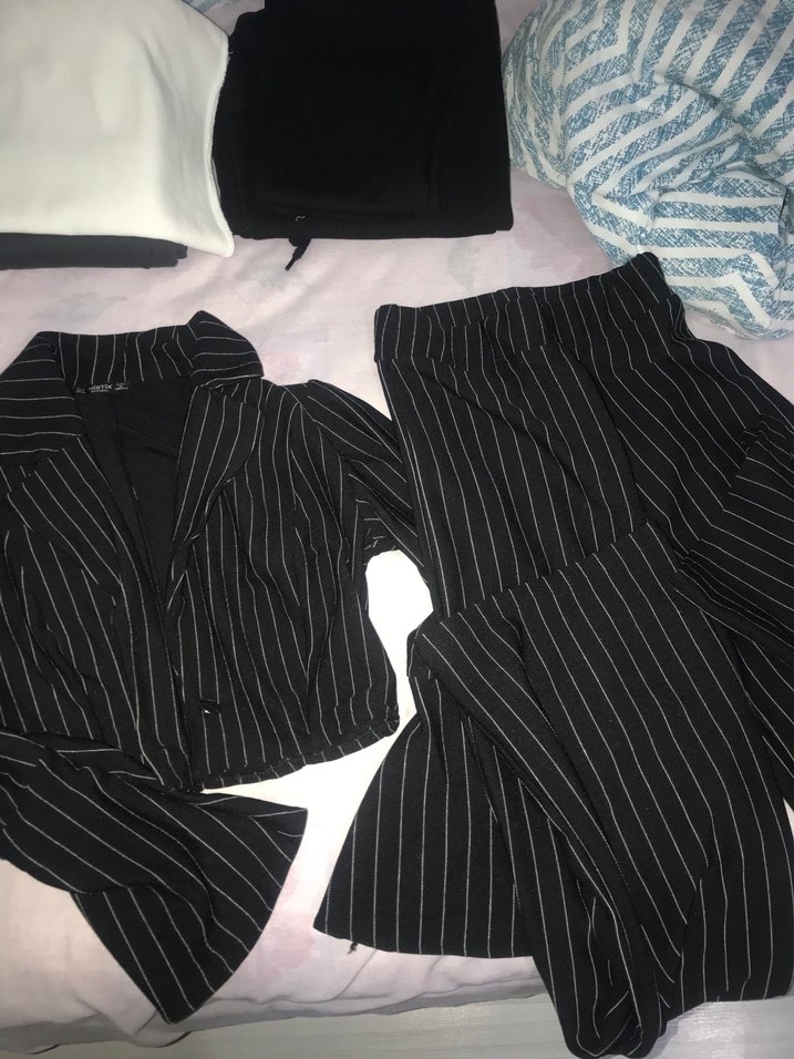 Siyah renkte, çizgili midi uzunlukta kadın takım elbise. Normal kesim, çentikli yaka, pileli detaylar ve askılı kollar içerir. Ofis ve günlük kullanım için uygun.